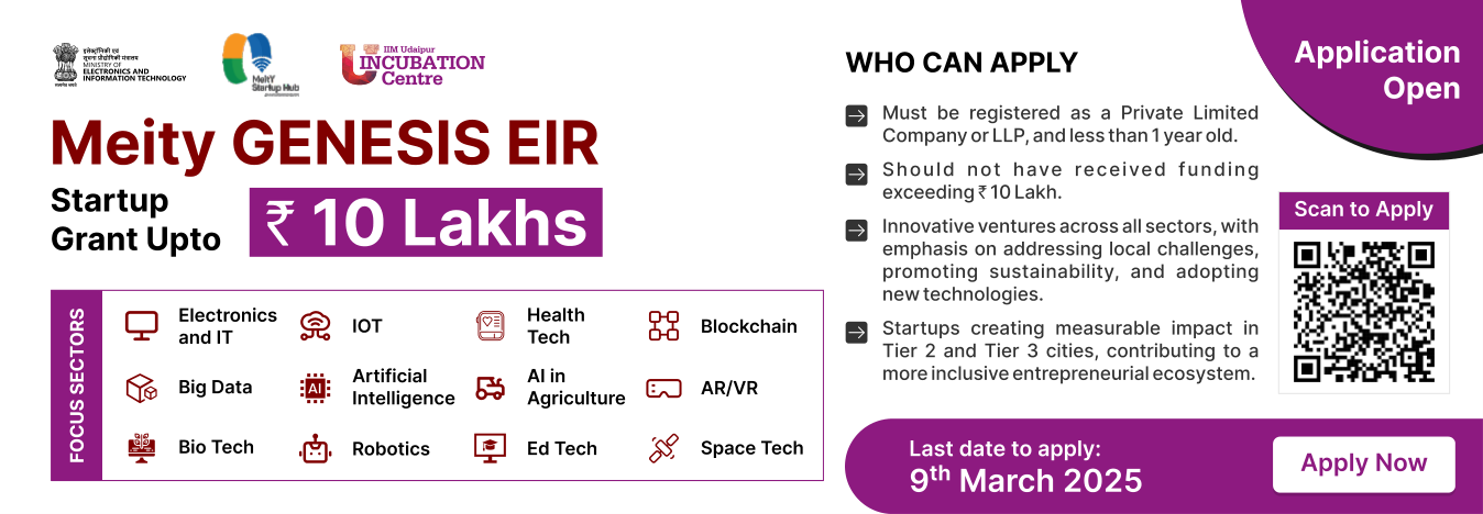 The Genesis EIR (Entrepreneur-in-Residence) Program by IIM Udaipur Incubation Centre (IIMUIC) is a strategic initiative under the GENESIS scheme, designed to support early-stage startups in cuttingedge domains such as IOT, Artificial Intelligence (AI), Blockchain, and Deep Tech. The program provides aspiring entrepreneurs with financial assistance, mentorship, and a structured ecosystem to transform their innovative ideas into scalable businesses.